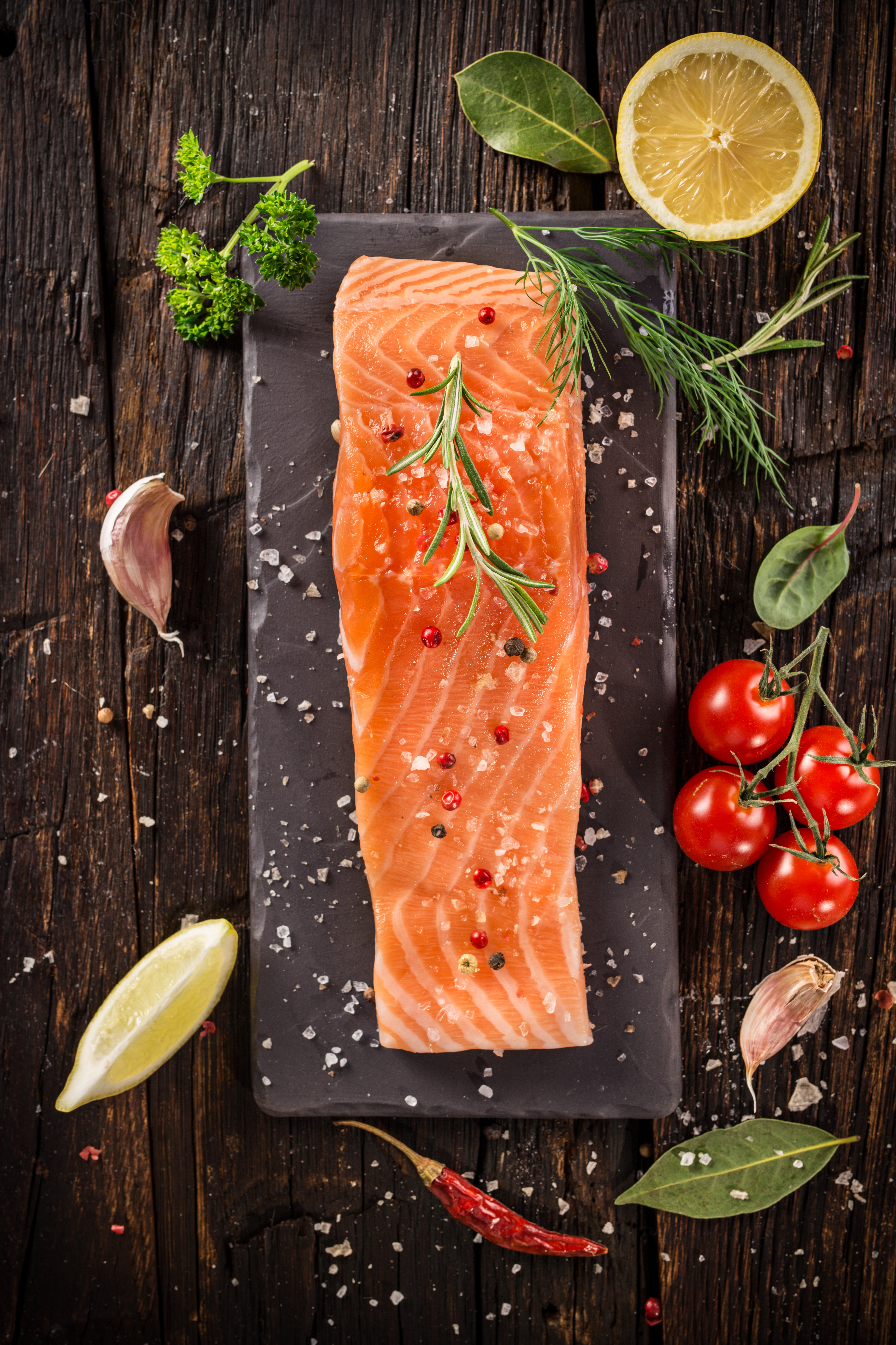 Lightly coat a cast iron or baking pan with garlic olive oil and butter olive oil. Place the salmon in the pan, then sprinkle with sea salt and parsley, and drizzle with garlic and butter olive oil. Squeeze half a lemon over the salmon. Add any optional vegetables to the pan. Bake at 400°F for 15-18 minutes